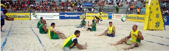 Todos são chamados a participar: 20 alunos da APAE – Vôlei sentado, praia de Icaraí, Niterói.
