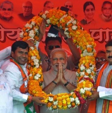 Governador do Estado de Gujarat desde 2001, Modi é visto como um líder firme e pró-ativo, com agenda desenvolvimentista e fortemente nacionalista. Sua principal promessa de campanha foi reanimar a economia indiana. Em seu tempo à frente de Gujarat, a região tornou-se uma potência econômica. Excelente orador, ele é frequentemente chamado de estrela mais brilhante do BJP, e seus membros já o apoiavam para primeiro-ministro muito antes de seu partido ter superado profundas divergências internas em torno do seu nome.